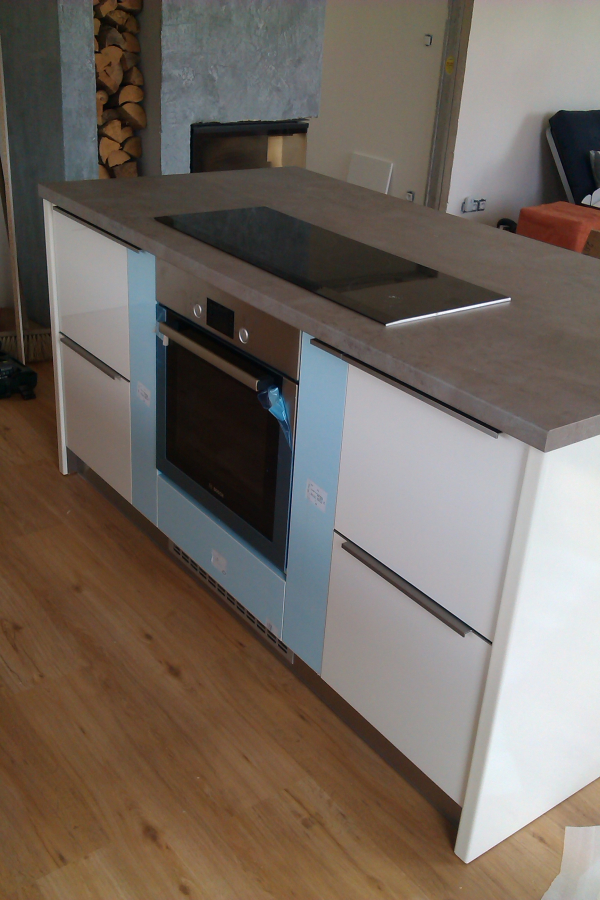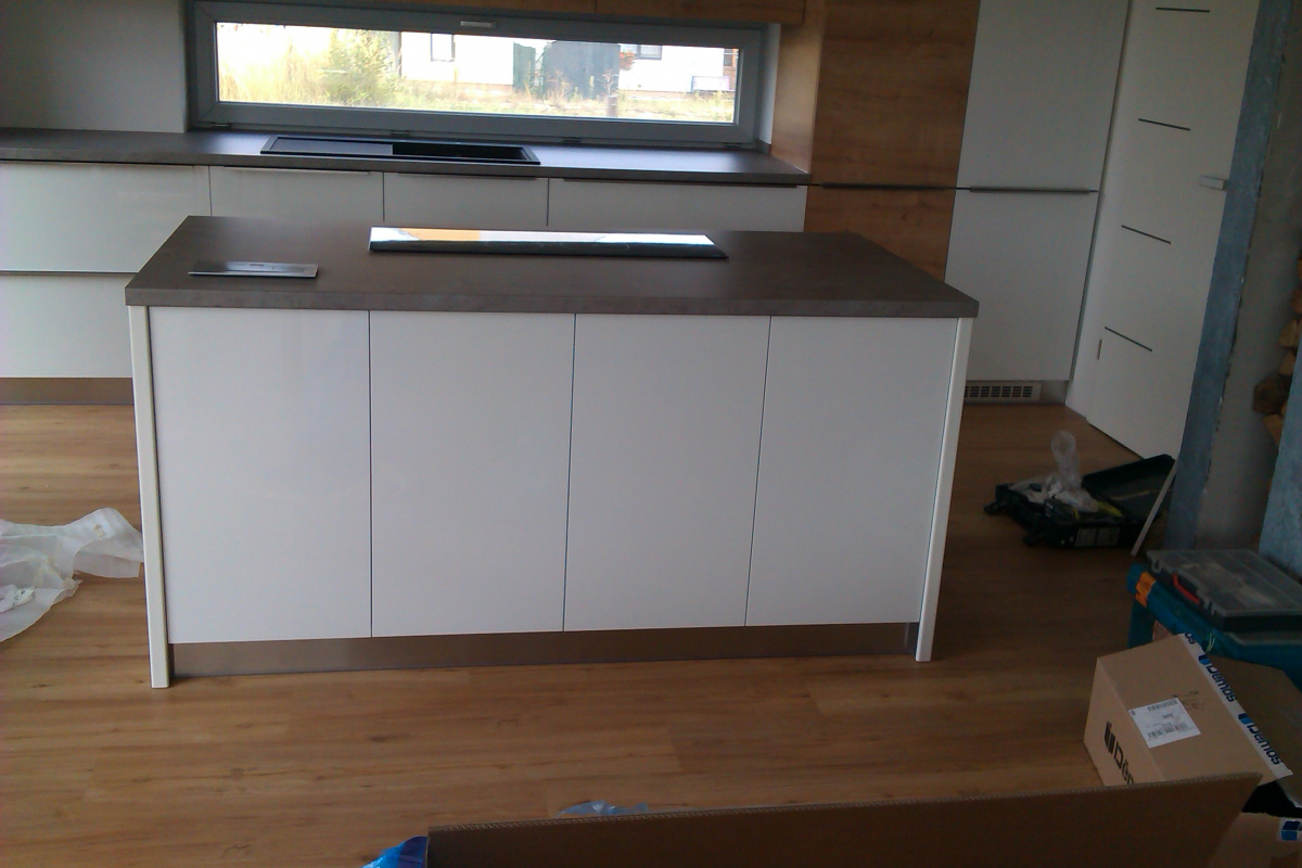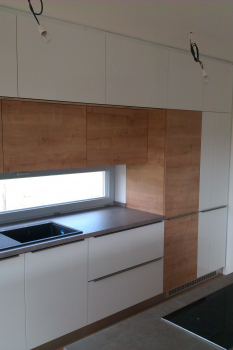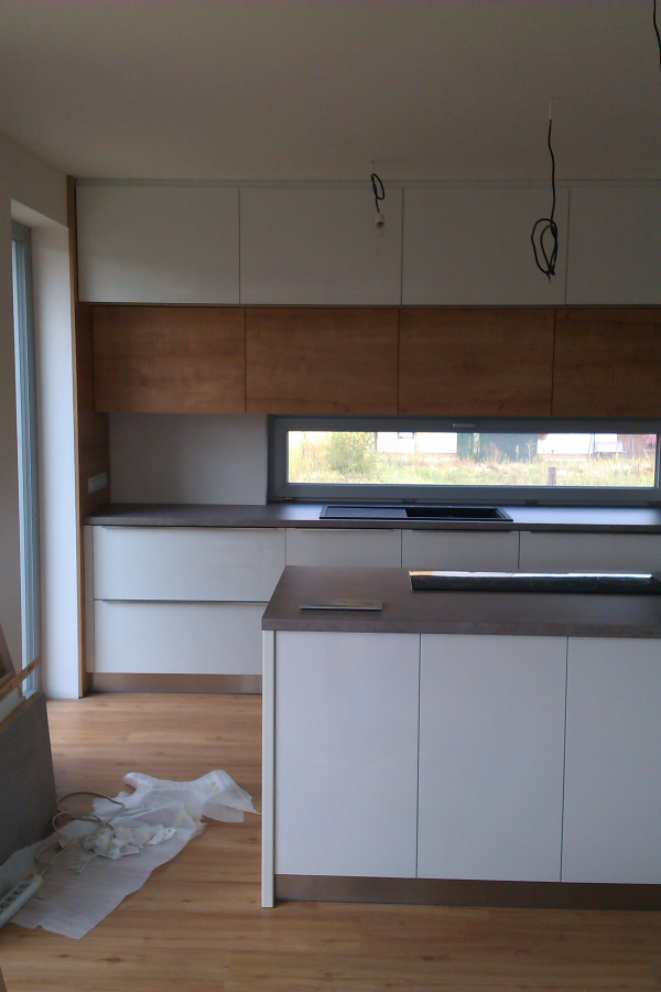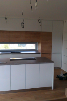 Kuchyňská linka typizovaná s vestavěnou lednicí, myčkou, horkovzdušnou troubou potravinovou skříní. Horní skříňky jsou zhotovené až do stropu ve dvou hloubkových rozměrech. Otevírání je řešeno bezúchytkově pomocí výklopů. Pracovní pult je v bílém lesku s pracovní deskou v dekoru beton světlí se zabudovanou varnou deskou a výklopnými zásuvkami. Linka je podsvícena led páskem.